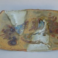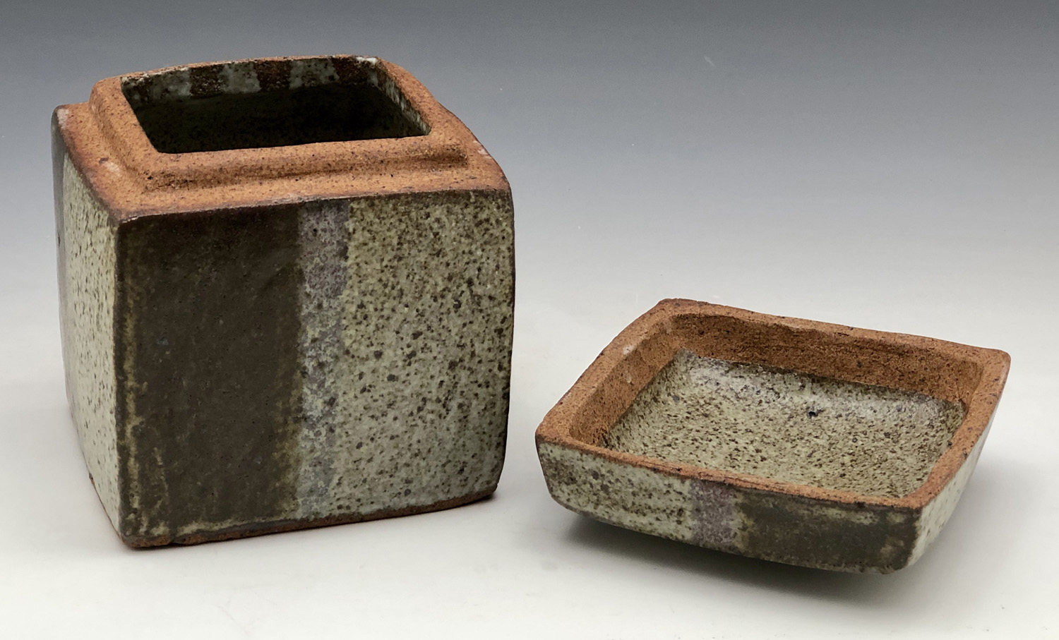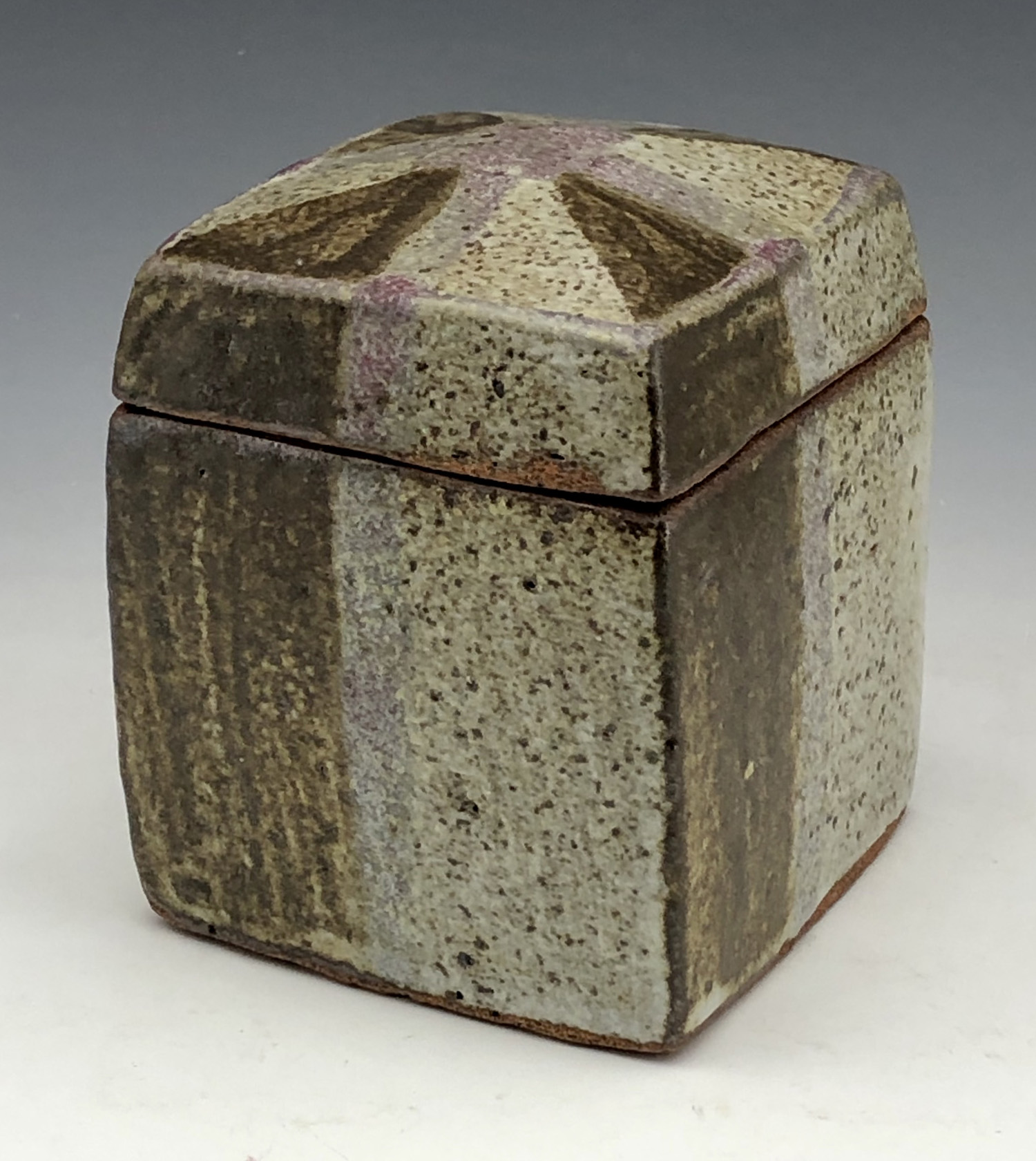 Square lidded box with brown stripes, unknown maker, 4″ x 4″ x 5” (10 x 10 x 12.6 cm)