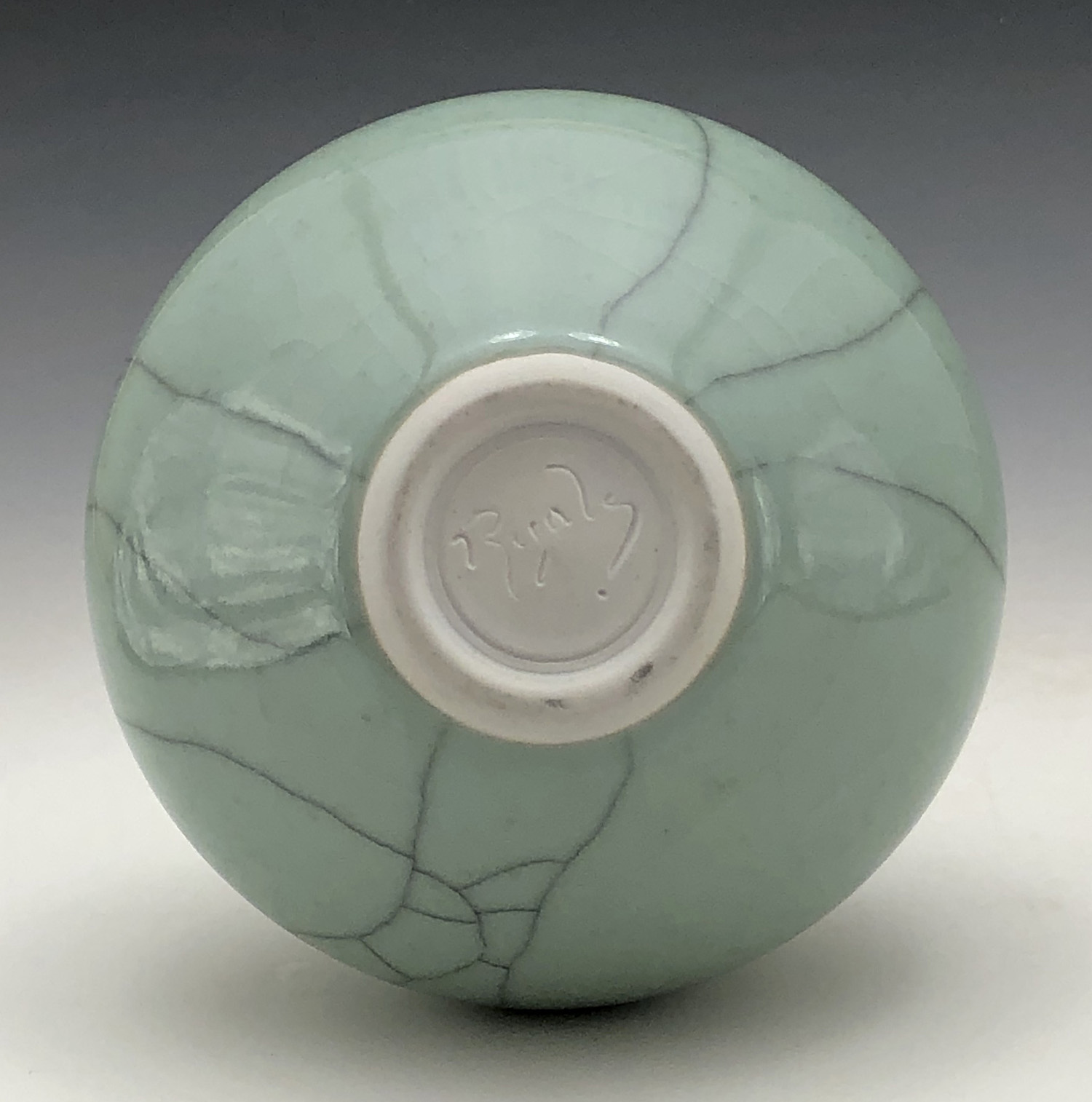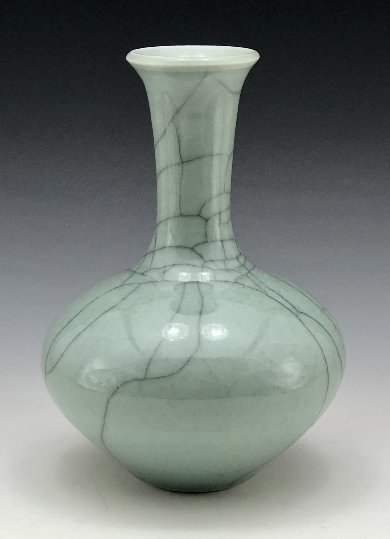 Terry Ryals, fine tall-necked celadon vase with crackle pattern, 5.35 inches dia x 8 inches tall, (13 cm dia x 20.25 cm tall)